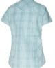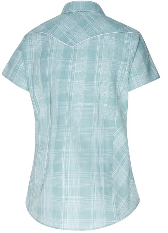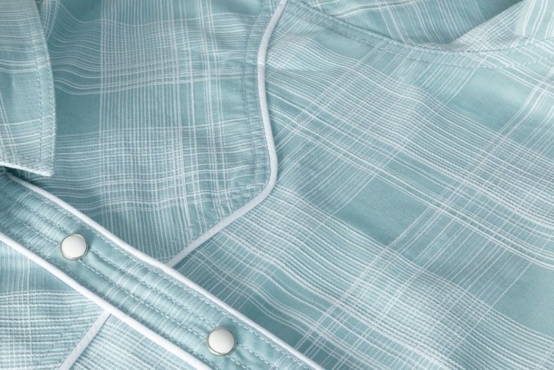 Joli chemisier à manches courtes à carreaux bleu clair avec empiècement western et boutons pression blancs.