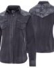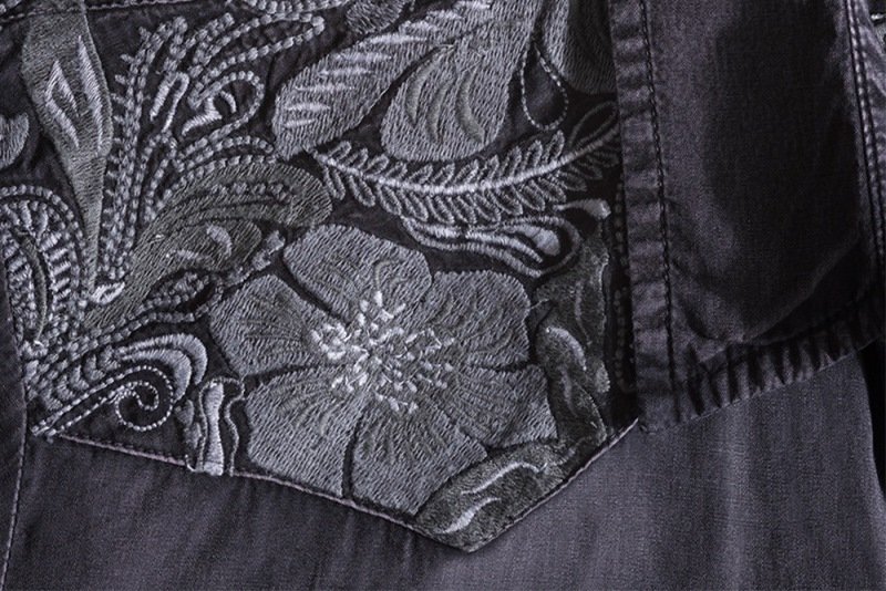 L’empiècement renforcé Western sur les épaules, orné d’une broderie florale élaborée qui ajoute une touche de féminité qui met en valeur par des couleurs contrastantes une touche moderne. avec deux poches plaquées sur la poitrine, soulignées par des coutures décoratives claires et contrastantes, renforçant l’aspect traditionnel tout en apportant une touche stylisée. Dotée de boutons-pression noirs, caractéristique du style western.